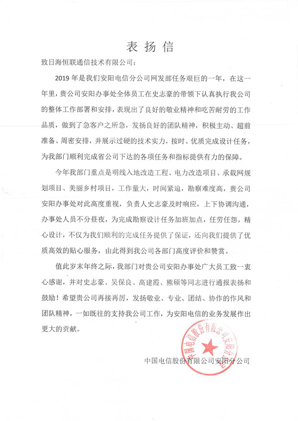 轉(zhuǎn)發(fā)“中國電信股份有限公司安陽分公司”對(duì)我公司員工的一封表揚(yáng)信