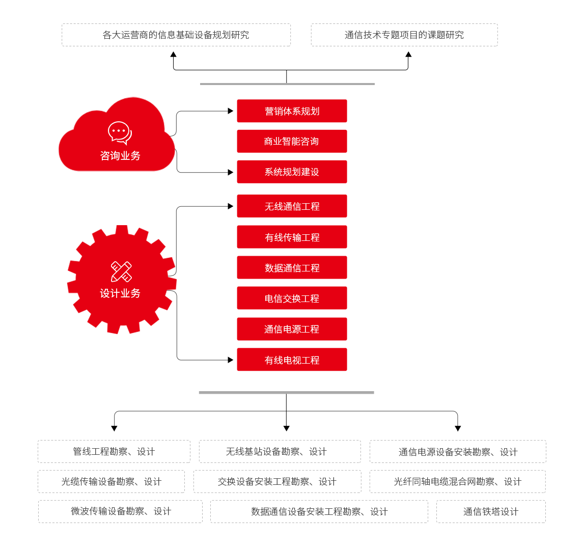 為客戶提供通信網、計算機網、廣播電視網等網絡的設計咨詢服務;為通信企業(yè)提供綜合發(fā)展規(guī)劃、戰(zhàn)略規(guī)劃 專題規(guī)劃、業(yè)務咨詢及管理咨詢等咨詢服務。公司擁有工程設計、工程勘察等國內通信設計領域的頂級資質;優(yōu)質的服務質量,快速的業(yè)務響應能力、標準化、規(guī)范化的服務流程以及優(yōu)秀的工程設計項目質量為公司在業(yè)界取得良好的口碑。